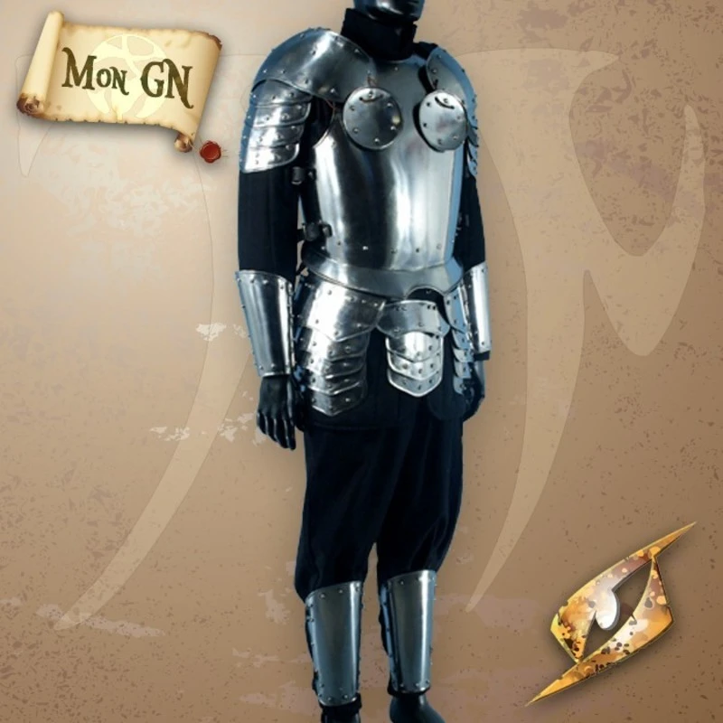 L’armure complète de Guerrier impose son style grâce à une série de rivets qui se retrouve sur toutes les pièces de l’armure et à son rendu métal chromé. Cette armure est prêt à porter et elle s’ajuste facilement au corps grâce aux sangles situées sur chaque pièce. C’est une armure adaptée pour des batailles de GN intenses et épiques.