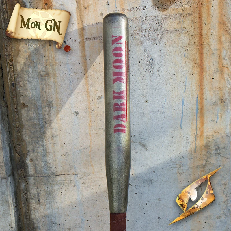 La batte de base-ball de Dark Moon est un bâton conçu pour frapper des home runs… si vous en trouvez dans les friches post-apocalyptiques. Cette batte de 80 cm de long a un manche de 30 cm enveloppé dans du cuir fendu brun doux et possède le pommeau typique d’une batte de base-ball à l’extrémité. Le reste de la batte a un effet métallique et de couleur verte, puis noir avec les mots « Dark Moon » peints en lettres rouges profondes.