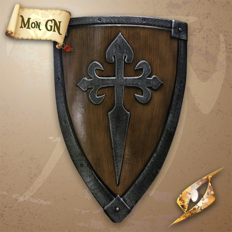 Le Bouclier de Croisé est un écu semi-courbé inspiré des Normands du 10e au 12e siècle. Avec une peinture ressemblant à du bois naturel, un symbole héraldique métallique au milieu et un bord métallisé, ce bouclier s’adapte parfaitement à un personnage de type Croisé ou autre unité d’infanterie en GN/Larp.
