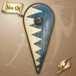 Le Bouclier normand a été peint à la main avec un motif tribal bleu et blanc, décoloré et vieilli pour le champ de bataille. Attachez ce bouclier à votre bras gauche ou droit grâce aux six sangles réglables en cuir.