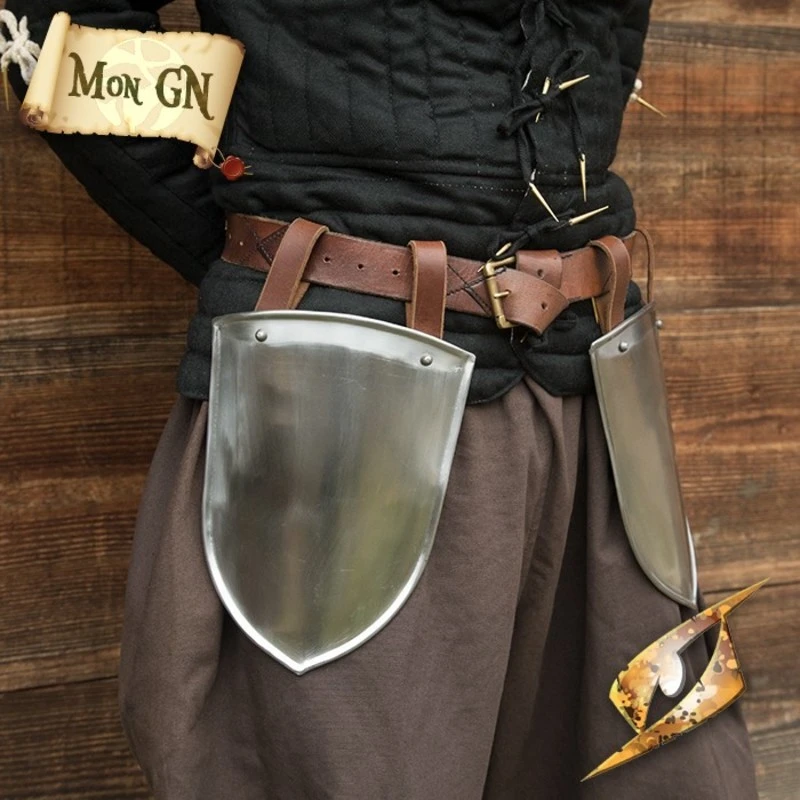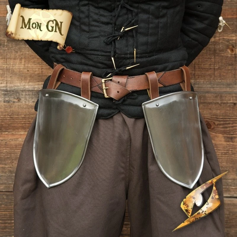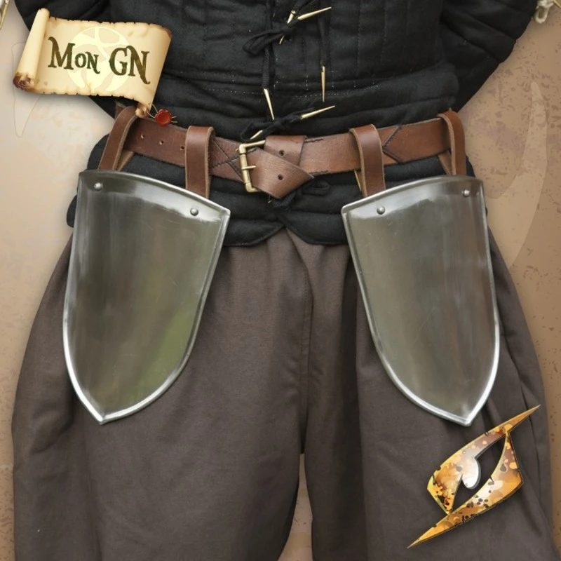 Les boucliers de ceinture de scout d’Epic armoury sont deux plaques conçues pour protéger les cuisses. Ces plaques d’acier à bords arrondis sont suspendues à votre propre ceinture pour couvrir l’extérieur des cuisses. Elles se mettent en place à l’aide de boucles de cuir solidement fixées par des rivets. Chaque plaque mesure 25 cm de long et 19 cm de large, avec deux boucles de cuir pliées de 24 cm.