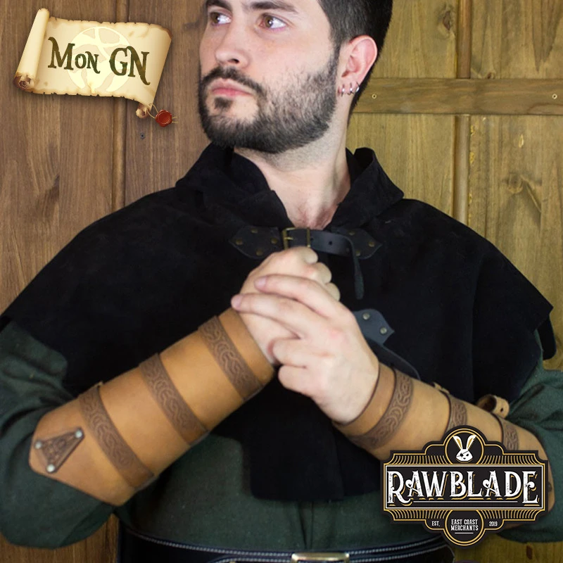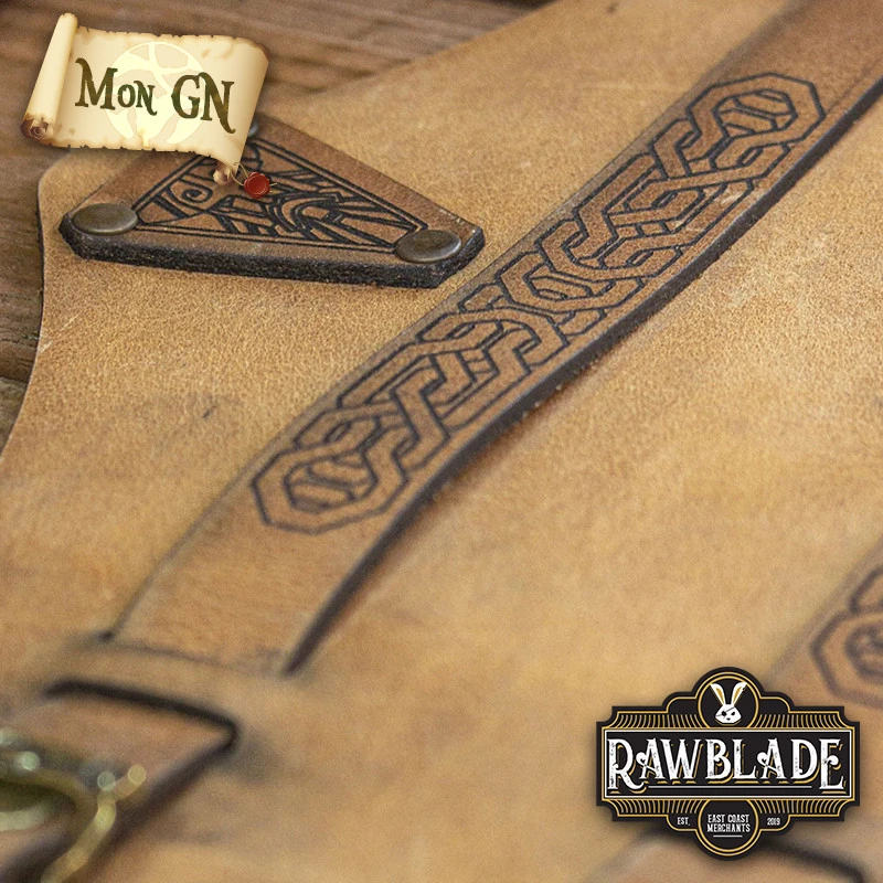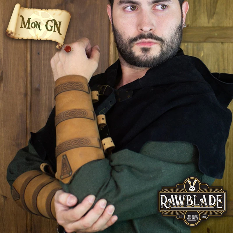 Des brassards en cuir de haute qualitĂ©, d’une Ă©paisseur de 2,5 mm. Le cuir est marquĂ© de motif celtique et de grandes lanières de fixation Ă boucles. ComplĂ©tez votre set avec des brassards beaux et solides !