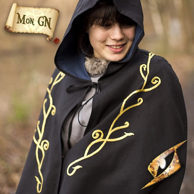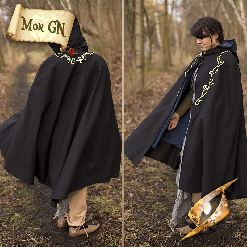 Cette Cape est faite pour l’action, vous pouvez courir et vous battre avec sans qu’elle n’entrave vos mouvements. Les extrĂ©mitĂ©s avant tombent au niveau des genoux, Ă l’arrière elle descend Ă mi-mollet.