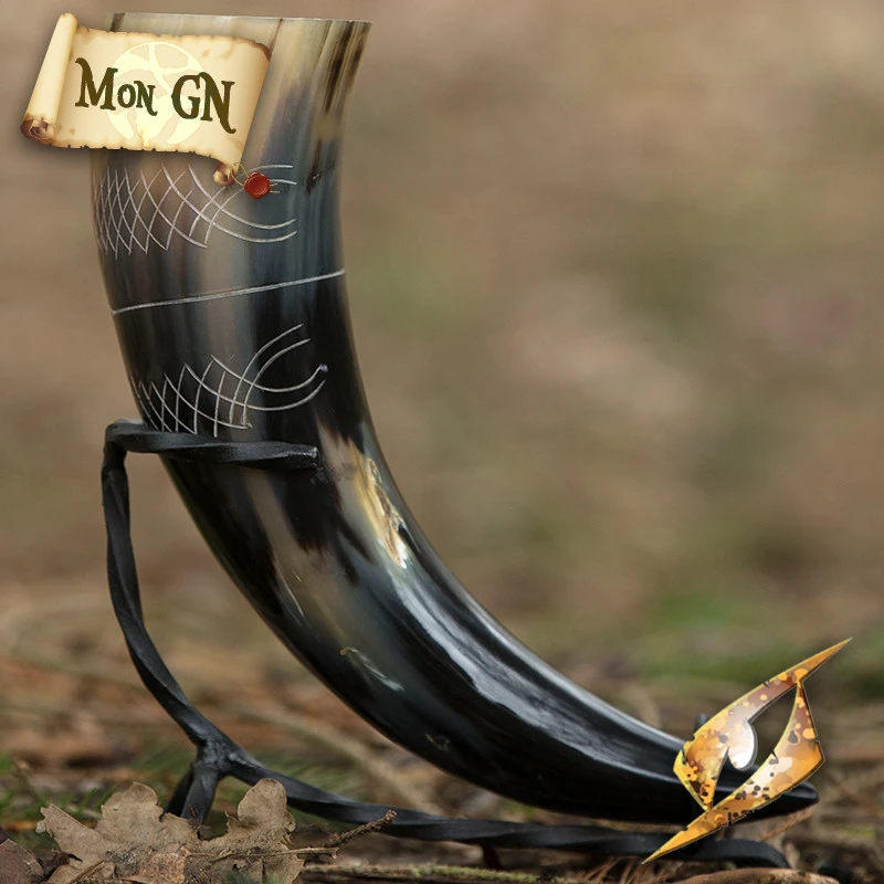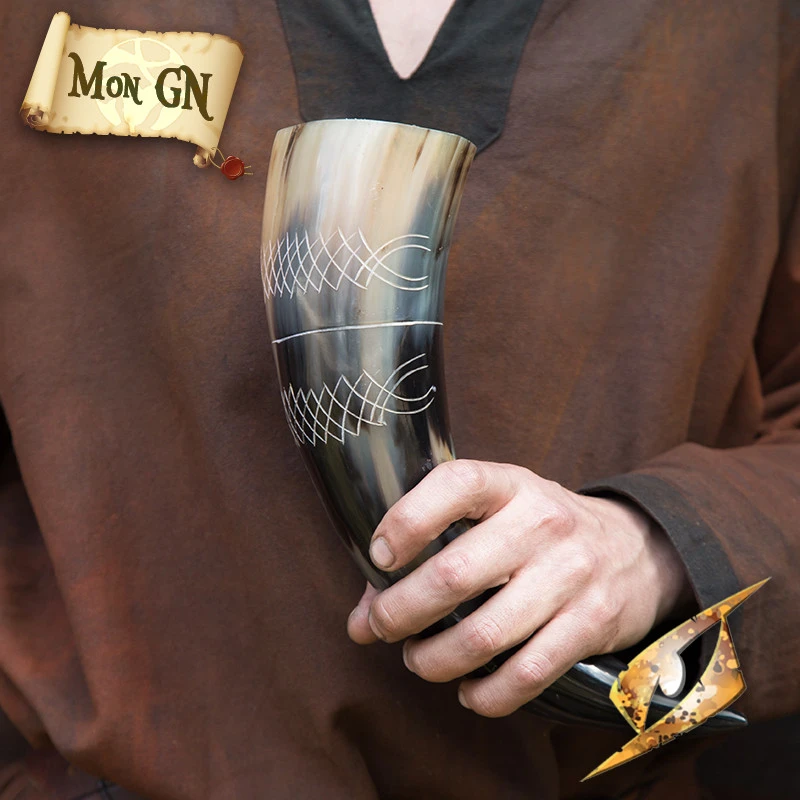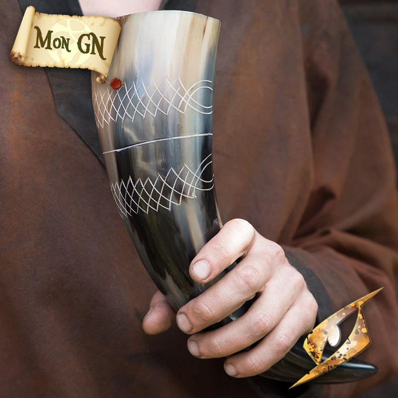 La Corne de Jarl est un récipient conçu pour contenir un demi-litre de votre boisson préférée. Sentez la force et la bravoure vous envahir lorsque vous tenez cette authentique corne de taureau dans votre main, portez un toast et racontez vos histoires de guerre. Le produit est fait de corne authentique récoltée sur le buffle d’eau indien et fabriquée à la main. L’extérieur est poli à la perfection et gravé d’un motif entrecroisé, tandis que l’intérieur de la corne est traité pour la consommation alimentaire et la longévité à l’aide d’un revêtement de cire.