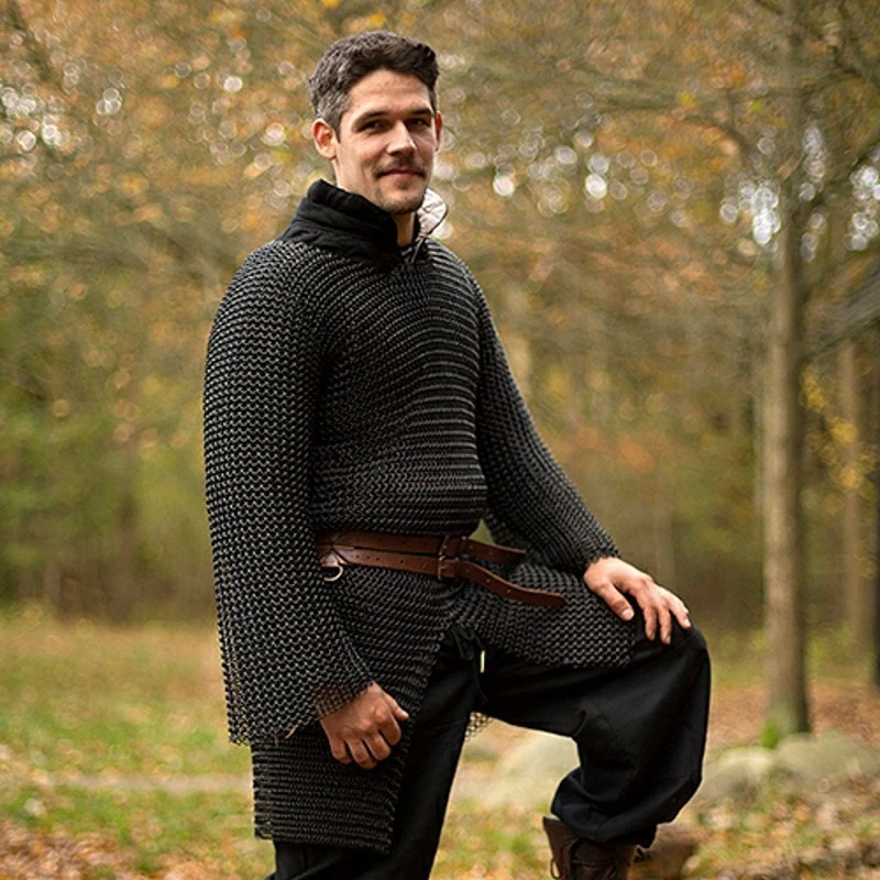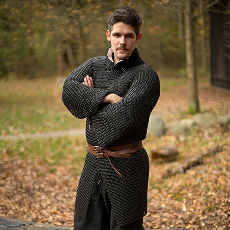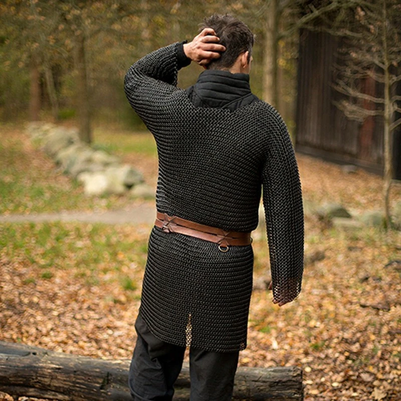 Longue cotte de mailles couleur sombre Ă manche longue.