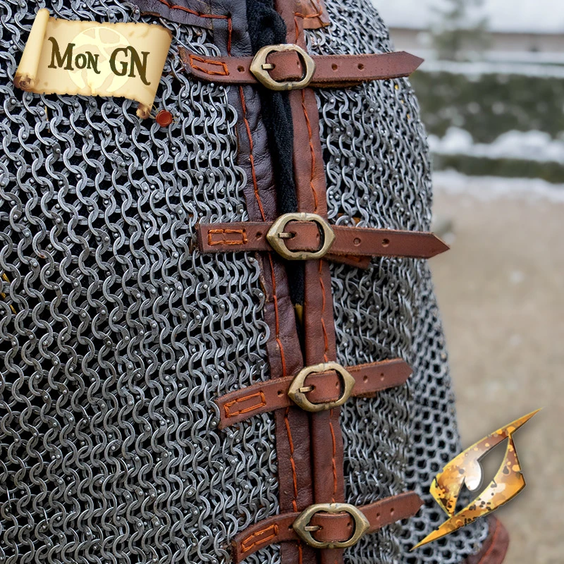 En tant que soldat de la Garde du Roi, vous avez besoin d’une armure de la plus haute qualité pour vous tenir fièrement près du trône de Sa Majesté. La cotte de mailles du soldat royal est une cotte de mailles flexible composée d’anneaux d’acier plats et rivetés. Chaque anneau s’emboîte avec quatre autres anneaux dans un design 4 en 1. La cotte de mailles couvre le corps de l’épaule aux cuisses, et ses manches courtes protègent le haut du bras. Tous les bords sont reliés en cuir, sauf le bas, et la chemise s’ouvre sur le devant grâce à six lanières de cuir bouclées en laiton, ce qui vous permet de vous glisser dans votre cotte de mailles beaucoup plus facilement que si vous deviez la faire passer par-dessus votre tête. Cette armure devrait durer longtemps en tant qu’équipement de reconstitution si le cuir et le métal sont correctement entretenus.