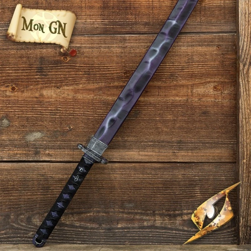 Le Dai Katana Ether de marque Epic Armoury est une épée en latex hybride au style asiatique (lame en mousse, manche et garde en polyuréthane). L’épée fait 100 cm de long avec une lame à un seul tranchant aux reflets allant du mauve foncé au blanc. Le long manche détaillé peut être tenu à une ou deux mains. La poignée fait 20 cm de long est peinte pour ressembler à une garde tressée.