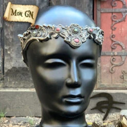 Sculpté et peint à la main en couleur or antique avec des détails comme des pierres précieuses incrustées vertes et rouges et des ornements complexes, il ressemble de façon réaliste au métal. Fixé à l’arrière par un large et solide élastique et une boucle de nœud papillon, il convient à tous. Parfait pour la noble dame médiévale, la reine viking ou la princesse de haute fantaisie.