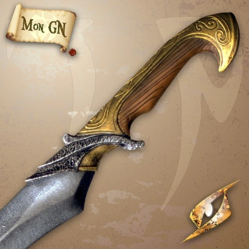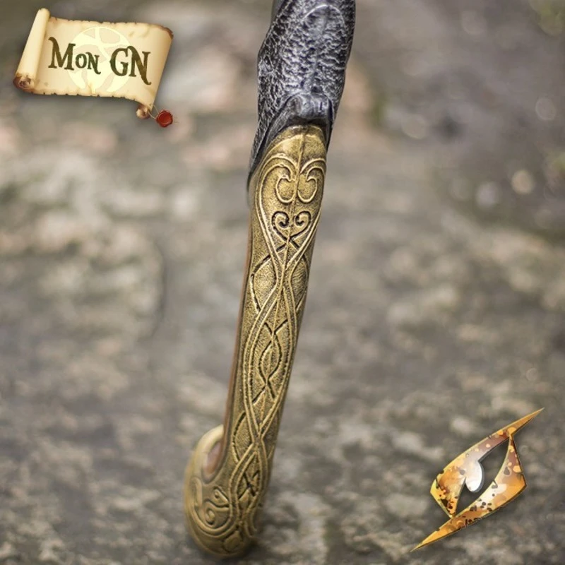 La Elven Sword de marque Epic Armoury est une lame en latex hybride faite pour les elfes ou les elfes noirs. L’épée fait 105 cm de long. Cette épée à un seul tranchant a également 80 cm de lame. La garde fait 11 cm de long, coulée et peinte pour ressembler à du bois avec des ornements incrustés de métaux.