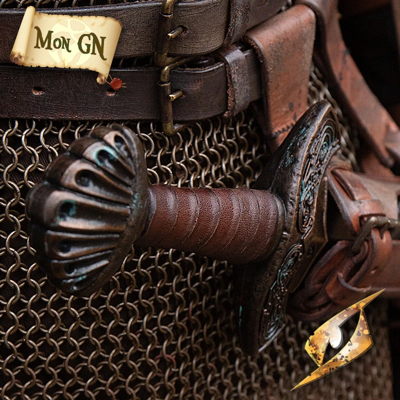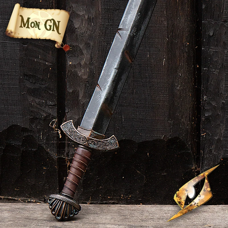 Votre épée est-elle chanceuse, noble ou assoiffée de sang – ou peut-être même traîtresse ? Elle l’est, si elle a hérité des compétences ou de la personnalité de ses anciens propriétaires. Elle porte peut-être même un nom comme « casse-pierre » ou « mordante ». L’épée viking portée au combat est une arme de prestige et un héritage, et tout comme l’épée légendaire « Skraep », qui a été déterrée toute rouillée dans la légende du fils du roi Vermund qui a sauvé le Danemark des Saxons, elle peut sembler en mauvais état à en juger par son aspect. Ce n’est pas le cas. Cette épée de 100 cm a une lame de 85 cm à pans coupés conçue pour être légère tout en conservant sa stabilité structurelle. La garde croisée est ornée d’un serpent complexe. La poignée est détaillée et longue de 10 cm, moulée et peinte pour ressembler à du cuir réaliste enroulé autour d’une poignée et d’un pommeau sculptés. Des effets de détails peints et sculptés uniques tels que des taches de rouille, des entailles et des rayures.