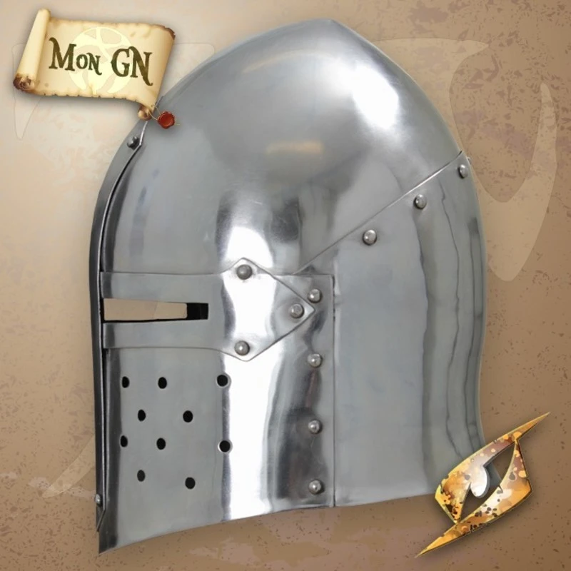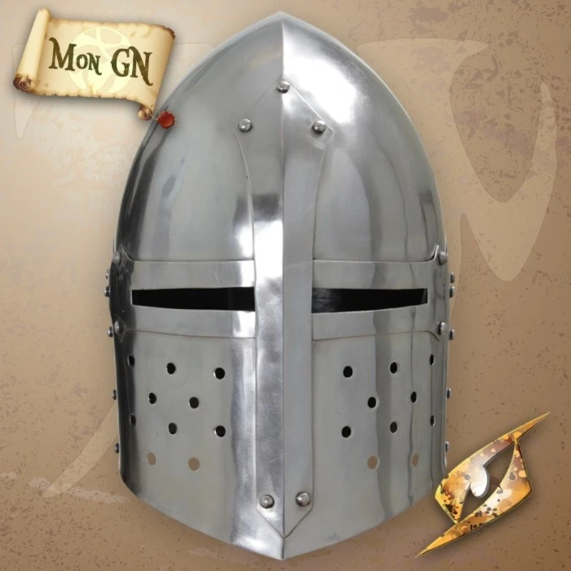 Le casque Grand Heaume est un modèle fantastique inspirĂ© des casques des chevalers. Casque Ă couverture complète avec fentes occulaires Ă©troites et multiples trous pour la respiration. La façade est ornĂ©e d’une pièce en acier en forme de croix. A l’interieur, une doublure en cuir avec rembourrage en mousse est lĂ pour vous offrir un meilleur confort. Il s’attache sous le menton grâce Ă une sangle en cuir.