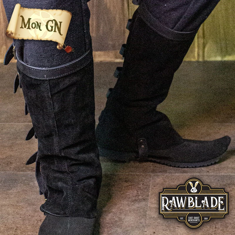 Guêtres en cuir fendu, réalisées en cuir haute résistance et épais. Cette pièce se ferme avec des boucles au mollet et une boucle autour du pied servant de fermeture pour qu’elle ne bouge pas. Le diamètre de la jambe mesurée au mollet ne doit pas dépasser 46cm de circonférence. La hauteur de 42cm couvre parfaitement la jambe.