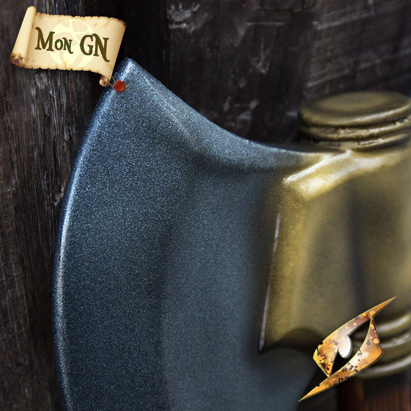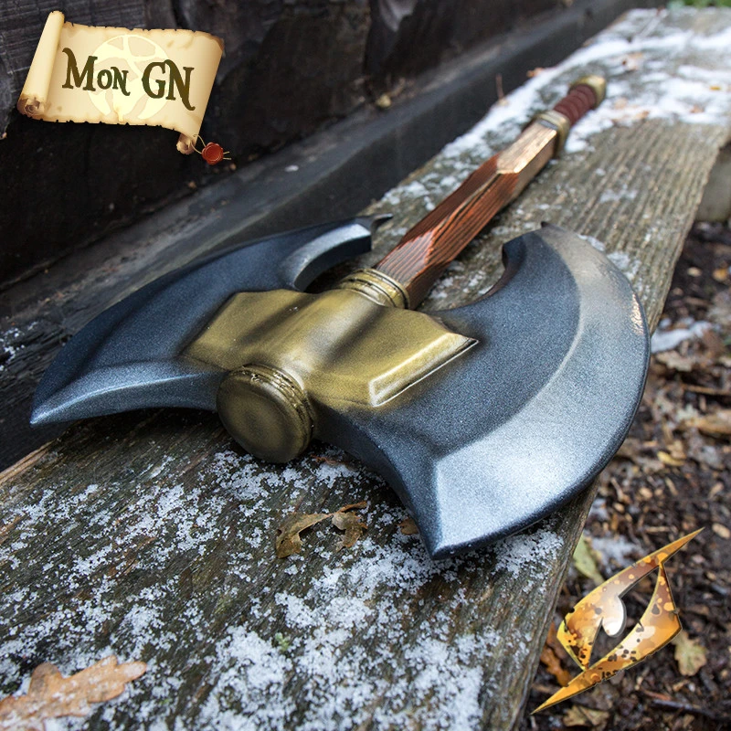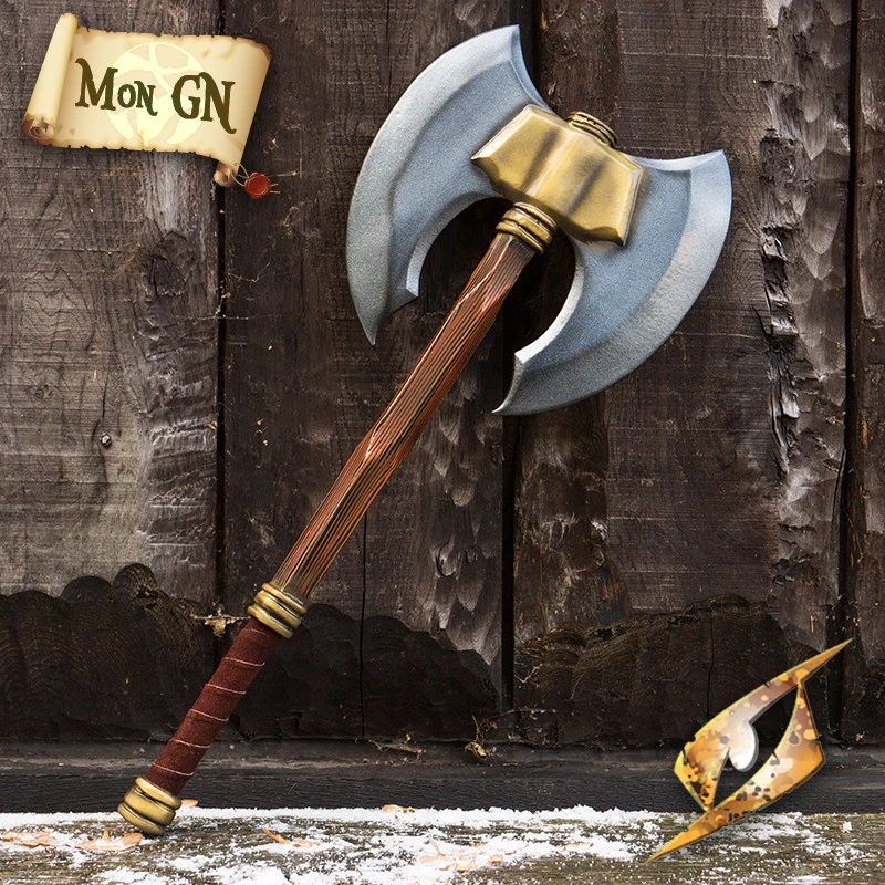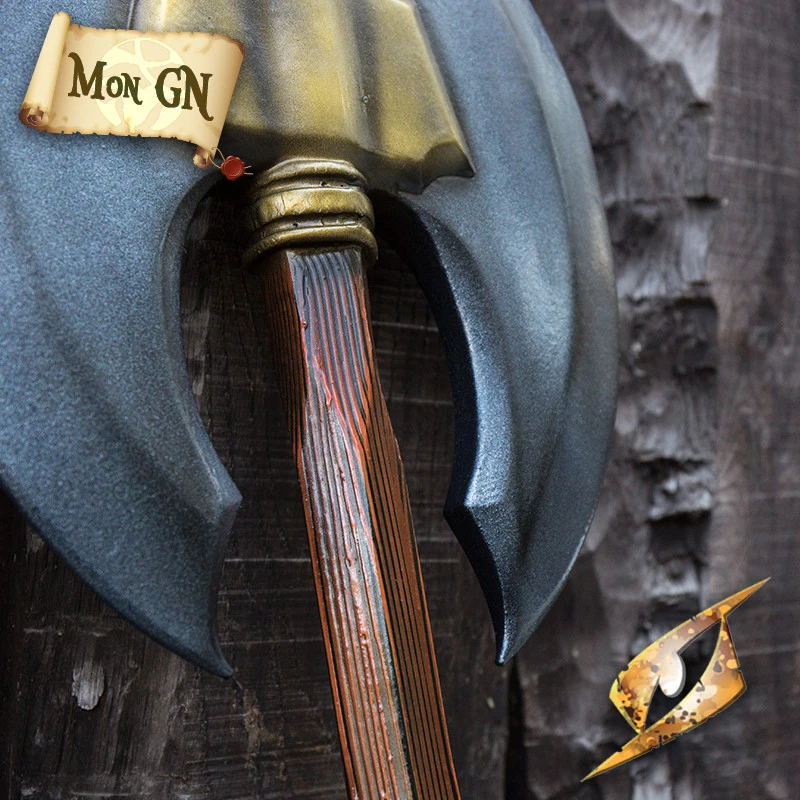 La hache de combat à double tête est une arme en latex idéale pour les guerriers nains du Nord. Avec une tête solide en forme de croissant qui s’incurve vers le manche texturé en bois, cette hache est faite pour être efficace au combat rapproché. Chaque tête a un long bord incurvé de 45 cm, et sa largeur de 16 cm est fixée au manche par une grande plaque en or. La longueur totale de l’arme est de 80 cm, avec un pommeau sculpté et un manche de 17 cm relié en cuir fendu.