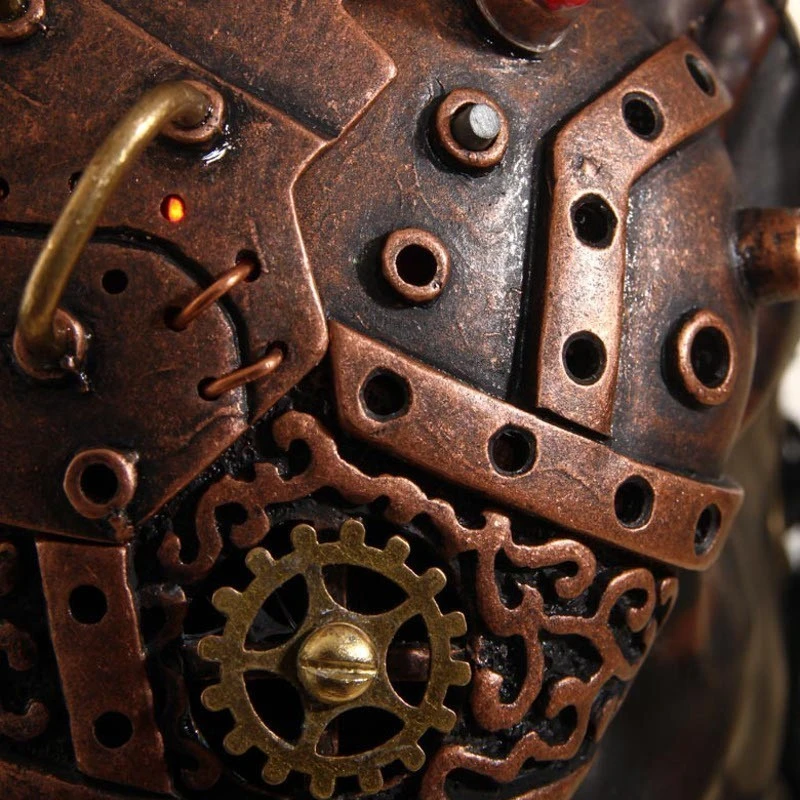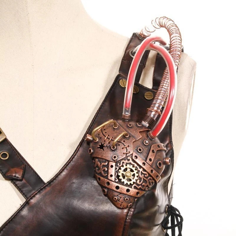 RĂ©alisĂ© en simili cuir brun teintĂ© de noir, il est ornĂ© d’un coeur mĂ©canique en bronze qui fait de la lumière en prenant une teinte rouge.