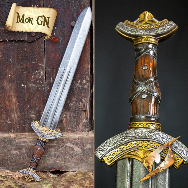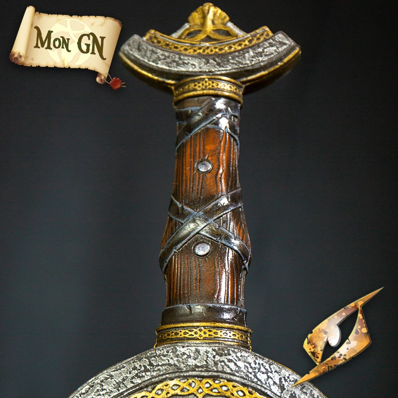 L’épée Warlord d’Epic Armoury fait partie de notre gamme hybride. La lame est conçue avec un noyau en fibre de verre encastré dans une mousse d’éthylène-acétate de vinyle (EVA) à cellules fermées recouverte de latex pigmenté. La poignée est en mousse de polyuréthane (PU) et présente des ornements imités en or et en argent, librement inspirés de l’art nordique de l’ère des Vikings scandinaves. L’épée s’intègre donc parfaitement dans les décors inspirés de cette période historique. Du point de vue du design, l’épée Viking est une bonne alternative, mais si vous recherchez un design authentique basé sur une vraie découverte, nous vous recommandons plutôt l’épée EirikR.