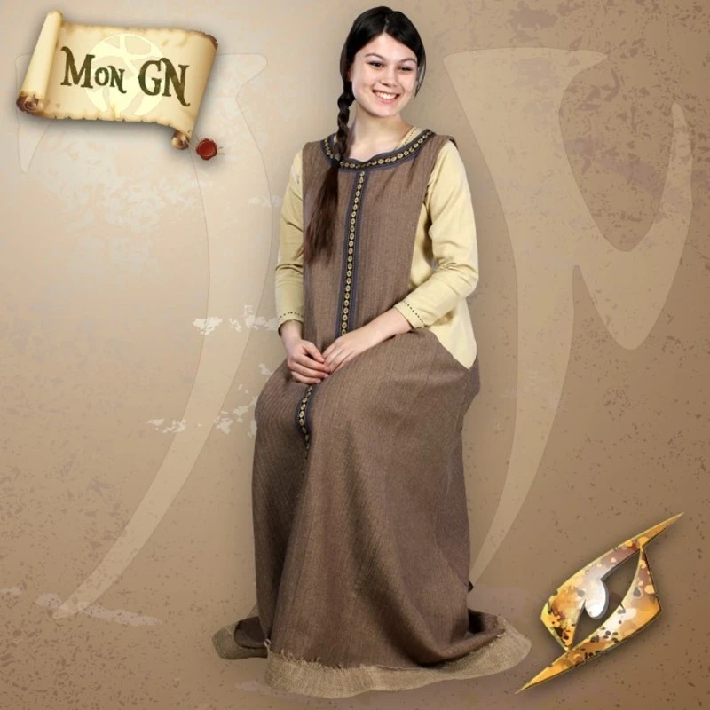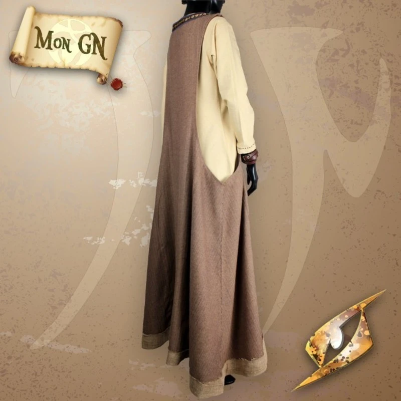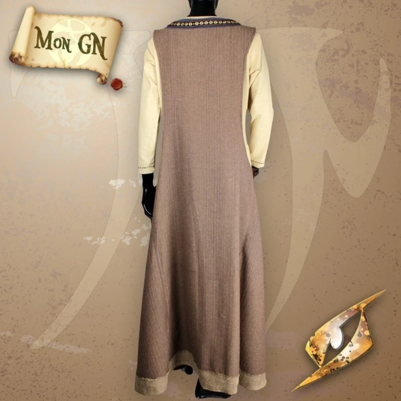 Robe descendant jusqu’aux chevilles avec de grands trous au niveau des manches. L’encollure est en forme de bateau et l’avant est décoré par une bande brodée de couleur bleu et gris