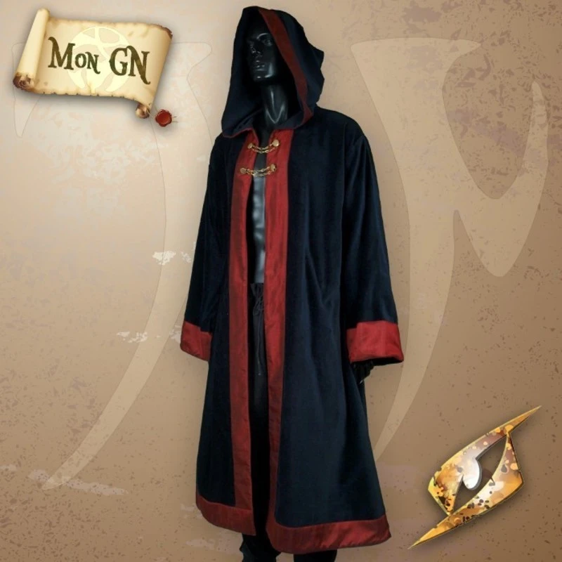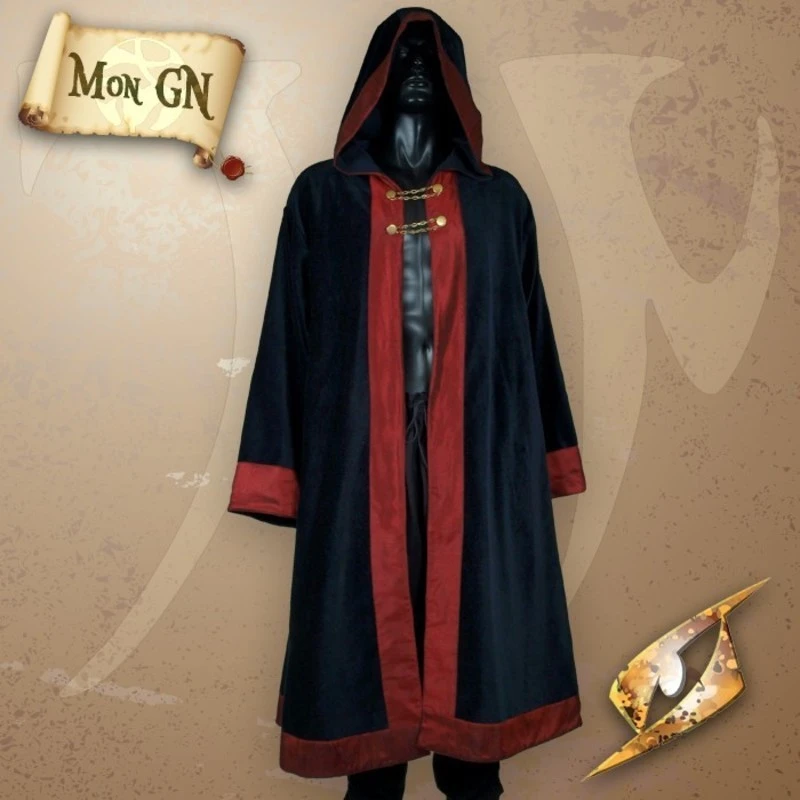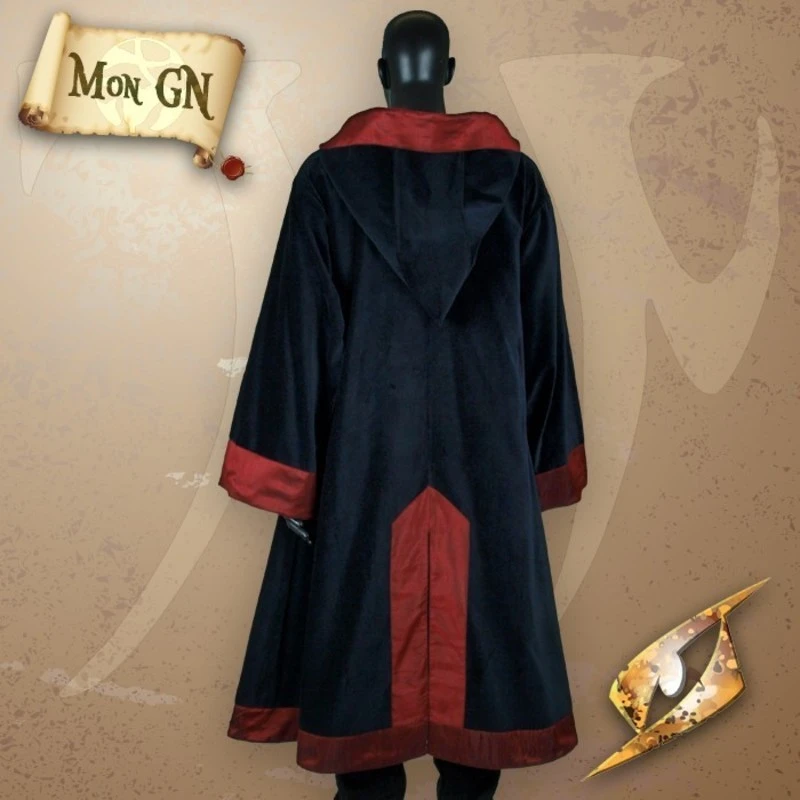 Robe en velours de coton, elle possède une très belle surface mate. Une belle bordure en polyester de couleur Or antique ou Rouge fait le contour des manches et de la robe. Elle se ferme Ă l’aide de deux chaĂ®nes dorĂ©es tenues ensemble par quatre gros boutons. La forme est dĂ©coupĂ©e pour ĂŞtre grande et ample.