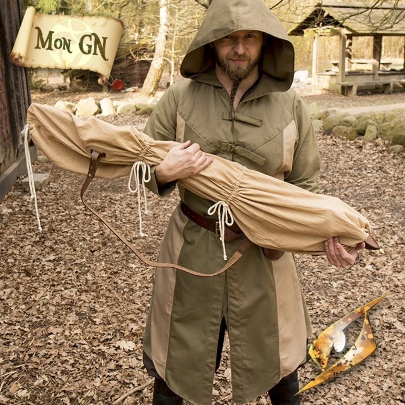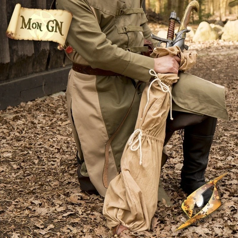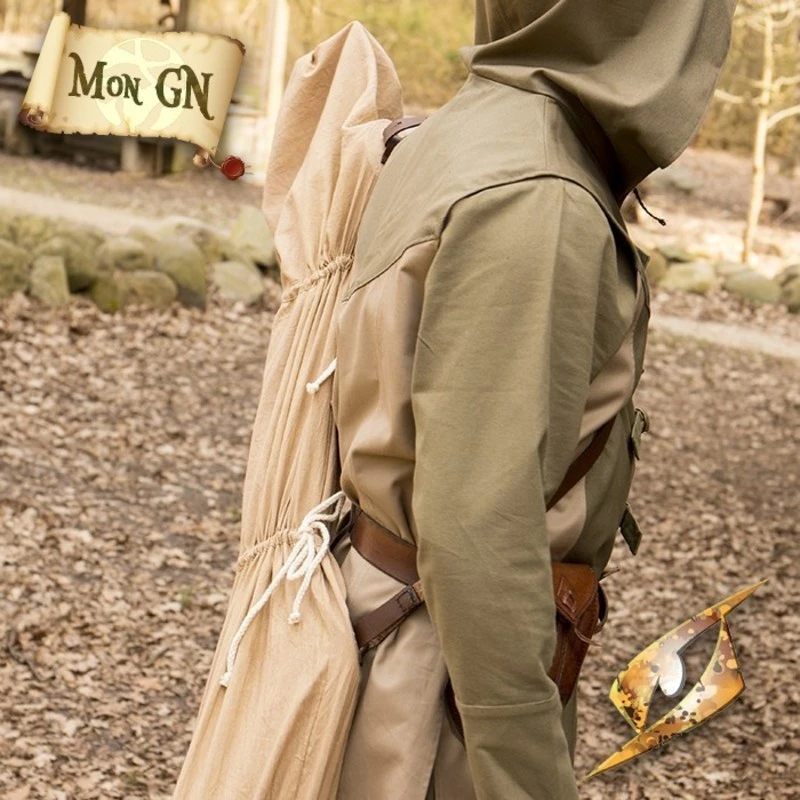 Fixez vos armes en toute sécurité à l’intérieur du sac à épée en nouant les trois cordons de serrage en coton autour d’elles, afin qu’elles ne se déplacent pas dans le sac lorsque vous vous déplacez. Un patch en cuir pleine fleur a été ajouté au fond du sac pour ajouter une durabilité supplémentaire par rapport aux lames d’épée en latex. Associez cet accessoire à un large assortiment d’équipements de l’Armurerie Epic et à différents styles de personnages.