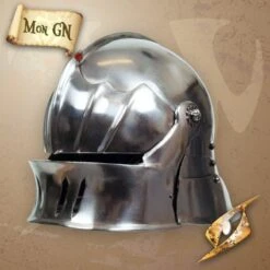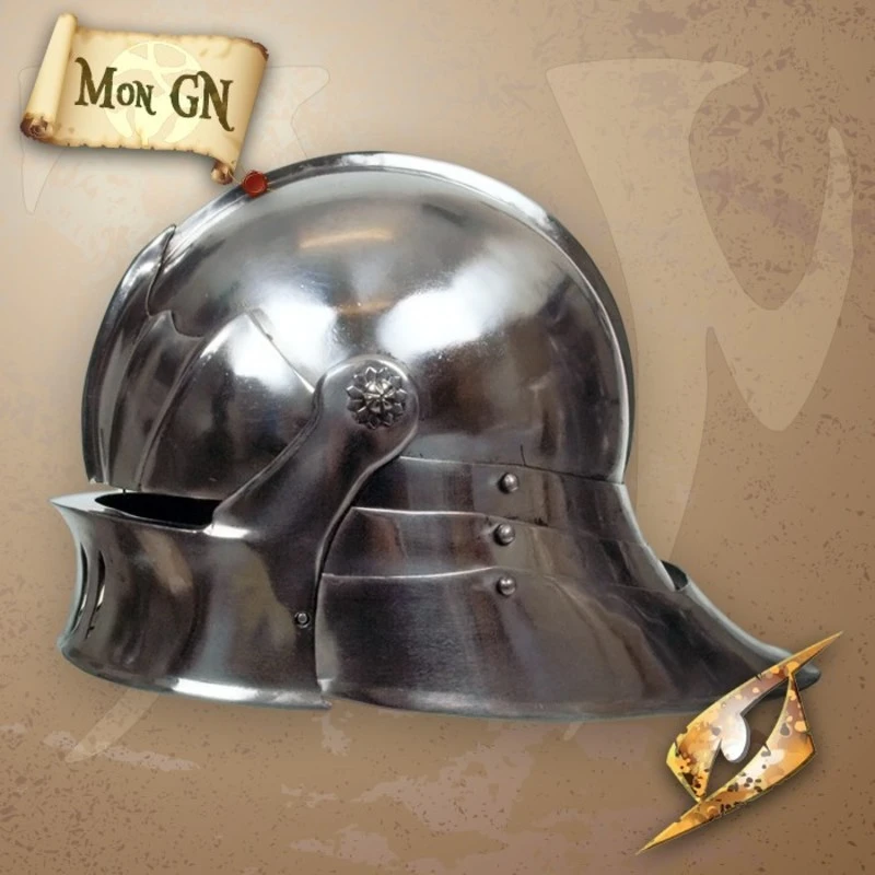 Casque à couverture complète avec visière et queue. La visière s’ouvre sur toute la hauteur, et la queue est de type queue de homard en trois parties. Ce casque offre une protection maximale à son porteur et permet une bonne visibilté grâce à sa large visière.