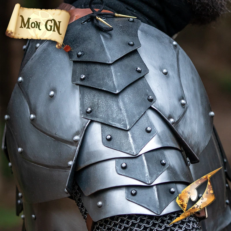 Ces spallières sont faites de plaques d’acier robustes qui protègent efficacement l’arrière des épaules et le haut du bras, tout en conservant le même design d’inspiration nordique, imposant, qui est commun à l’ensemble des Dreki. Le chevauchement des plaques et des rivets et la conception angulaire donnent à ces spallières un aspect intimidant, avec des plaques en métal sombre, qui descendent au milieu du bras, pour donner une symétrie à l’ensemble. La protection du bras est constituée de trois morceaux de plaques d’acier qui se chevauchent et qui sont maintenues ensemble par deux bandes de cuir. Les spallières Dreki sont reliés par deux lanières qui sont attachées directement au torse Dreki ou à d’autres armures de torse et gorgerin compatibles. Avec ses plaques qui se chevauchent, ses rivets et sa forme élancée, vous pouvez vous sentir comme un guerrier Nordique imaginaire, bravant la dureté du désert et tuant d’anciens dragons parmi les pics enneigés.