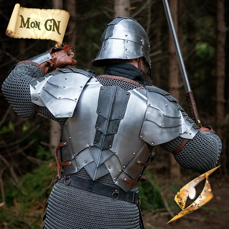 L’armure Dreki a deux couleurs, la première étant un métal poli mat et la seconde étant métal sombre, pour mettre en valeur les différents aspects de l’armure Dreki et montrer une fois de plus ses racines d’inspiration nordique. Fabriquée en acier doux poli d’une épaisseur de 1 mm et avec des sangles et des accessoires en cuir de première qualité, cette pièce d’armure est construite pour résister à des GN/LARP intensifs ou des reconstitutions avec un entretien régulier du cuir et de l’armure métallique.