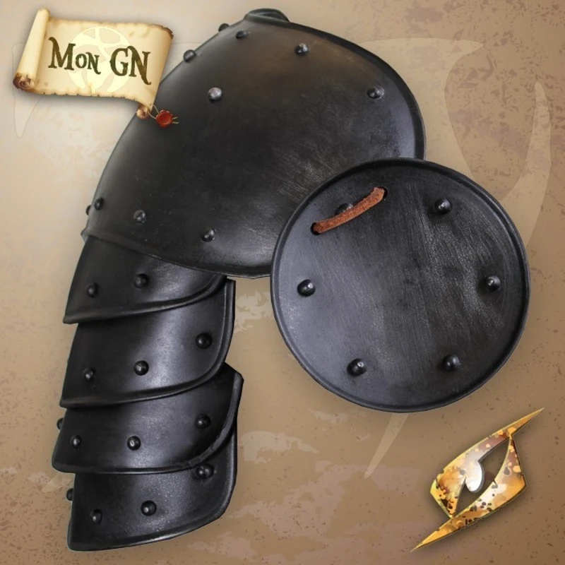 Paire de spallières articulées sombres, larges et simples avec rivets. Elle se fixe facilement à l’aide d’un gorgerin.