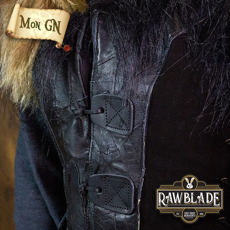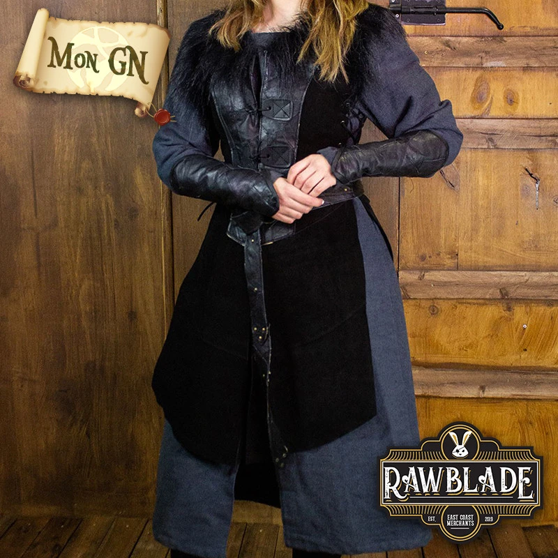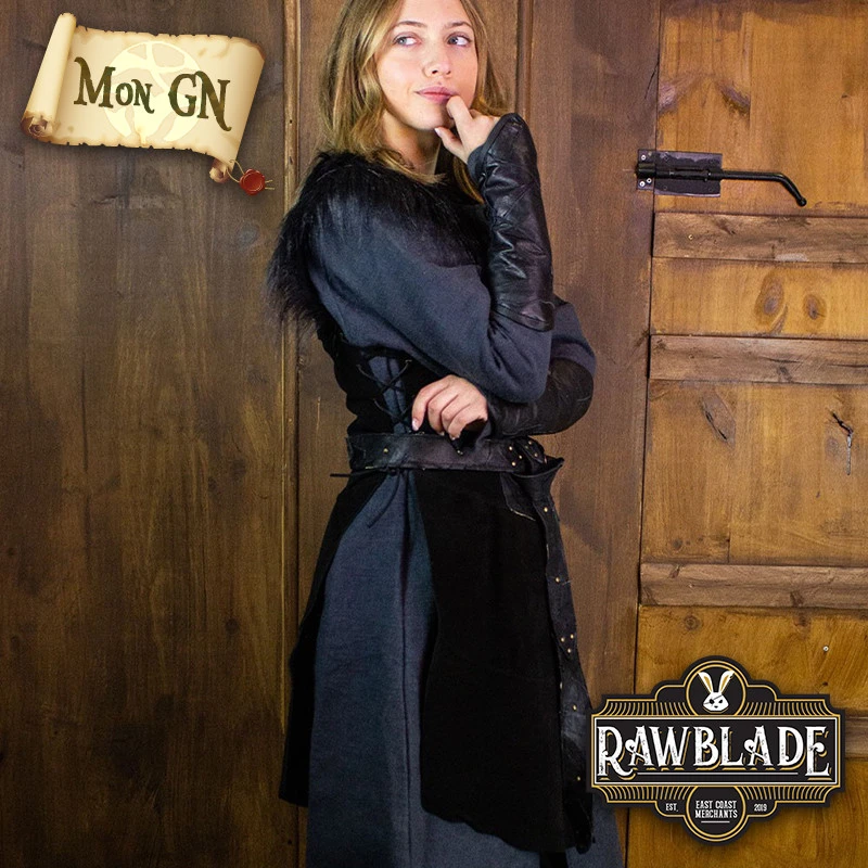 Le Tabard Raven Femme est fabriqué en cuir fendu gris, en cuir rapiécé de haute qualité et en fourrure synthétique sur le col et les épaules. Le système de fermeture, avec cordon en cuir, est confortable, facile et très résistant. Ne comprend pas les accessoires présentés sur les photos.