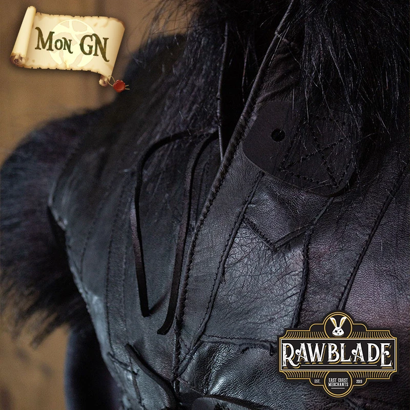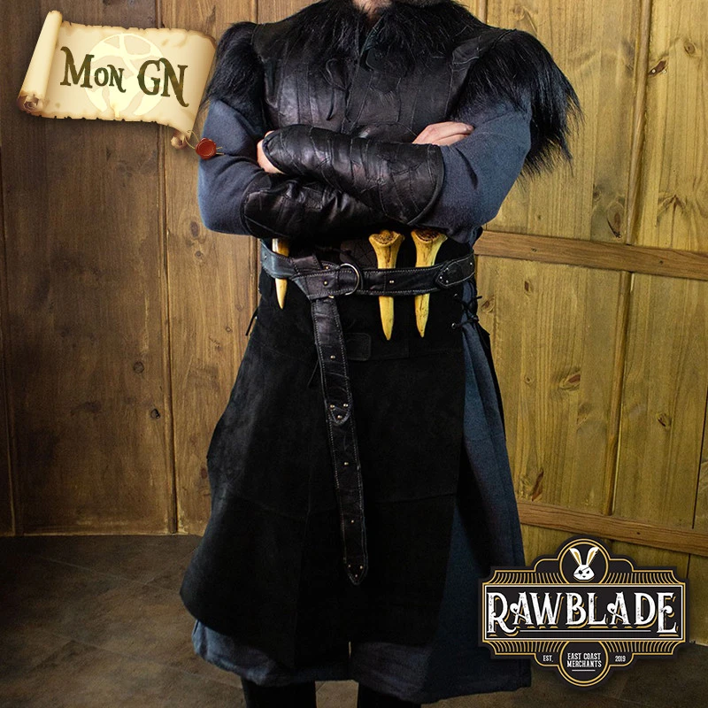 Le Tabard Raven est fabriqué en cuir fendu noir, en cuir rapiécé de haute qualité et en fourrure synthétique sur le col et les épaules. Le système de fermeture, avec cordon en cuir, est confortable, facile et très résistant. Ne comprend pas les accessoires présentés sur les photos.