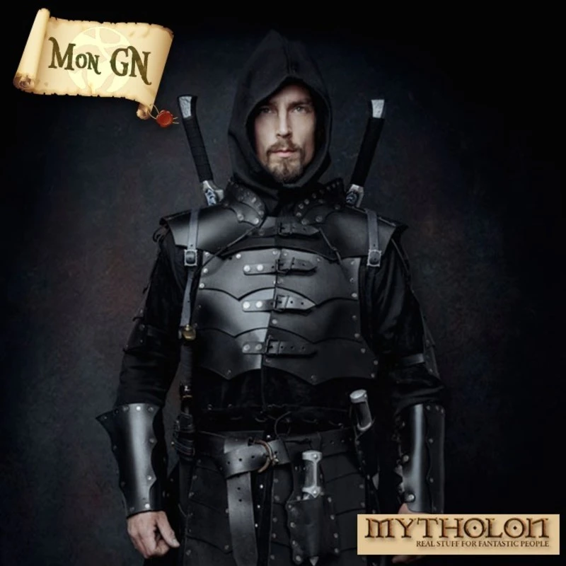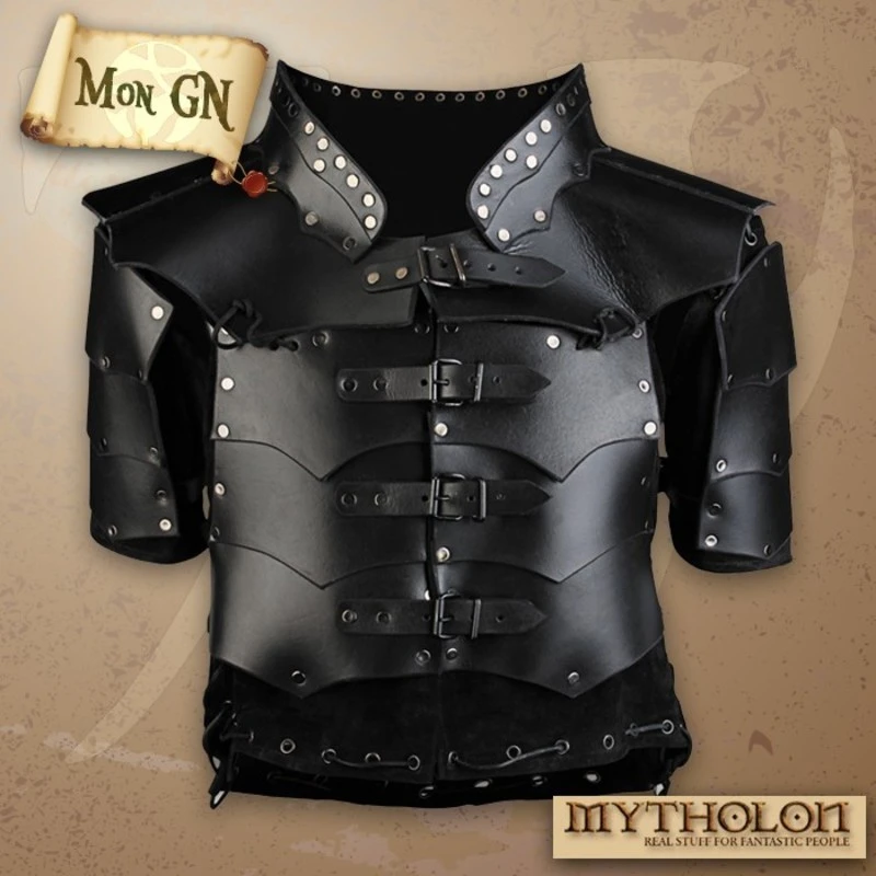 Ce torse d’armure formé de plaques épaisses de cuir intègre le torse, le gorgerin et les spallières, le tout fixé sur un gilet en cuir suédé ce qui le rend très facile et rapide à enfiler. Il se fixe à l’avant à l’aide de 4 lanières et s’ajuste facilement sur des torses de 100cm à 115cm de circonférence. 2 lanières permettent de fixer les spallière sur les bras.